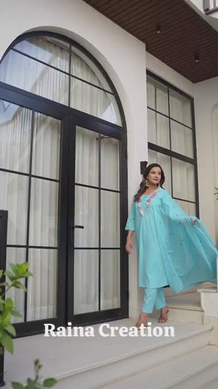 The straight-fit kurta is paired with matching solid cotton pants and a soft, lightweight dupatta adorned with subtle embroidery, making it perfect for festive gatherings, casual outings, office wear, and summer celebrations. The soothing fabric and vibrant hue ensure comfort without compromising on style.