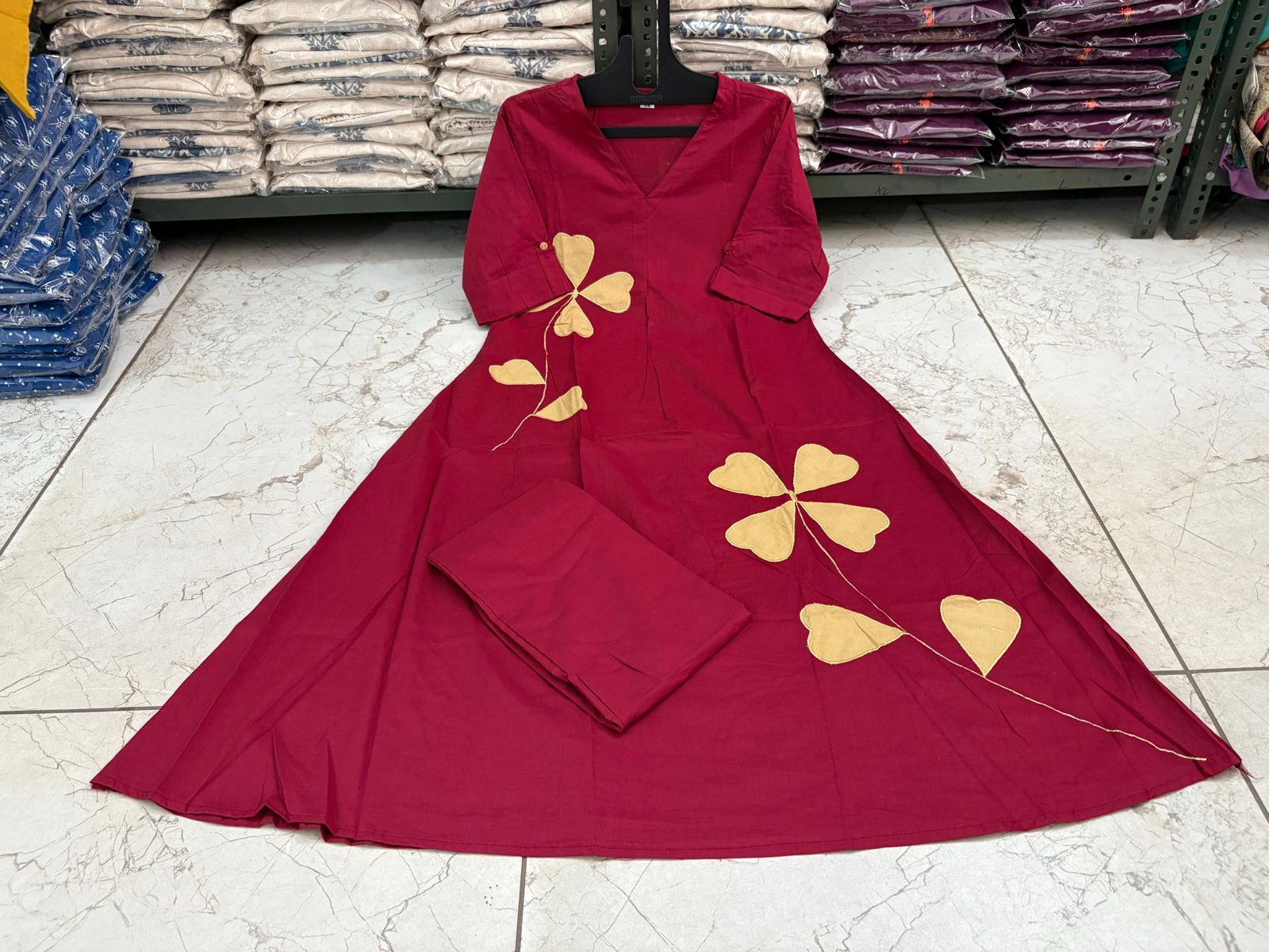 The kurta features a flattering V-neckline and a softly flared silhouette that drapes beautifully on all body types. What truly sets this piece apart is the delicate floral appliqué work in contrasting beige tones, adding a modern artisanal touch to the classic design. The 3/4th sleeves with button detailing enhance both style and functionality.